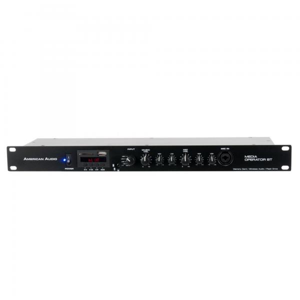 The American Audio, Media Operator BT is a fast, simple and reliable all-in-one MP3/Wireless Audio media playerdesigned for permanent installations where easy control of music is a must (ie. restaurants, fitnessstudios, retail locations, etc.) and great for mobile entertainers as well. The Media Operator BT offers digitalplayback from Memory Cards or USB sticks/drives.The Media Operator BT includes full MP3 playback control as well as a microphone input(XLR / 1/4″ combo), master volume control and 3x line output options. Plug the unit directly intopowered speakers, an amplifier or secondary mixer through the balanced XLR, 1/4″ or stereo RCA outputs.