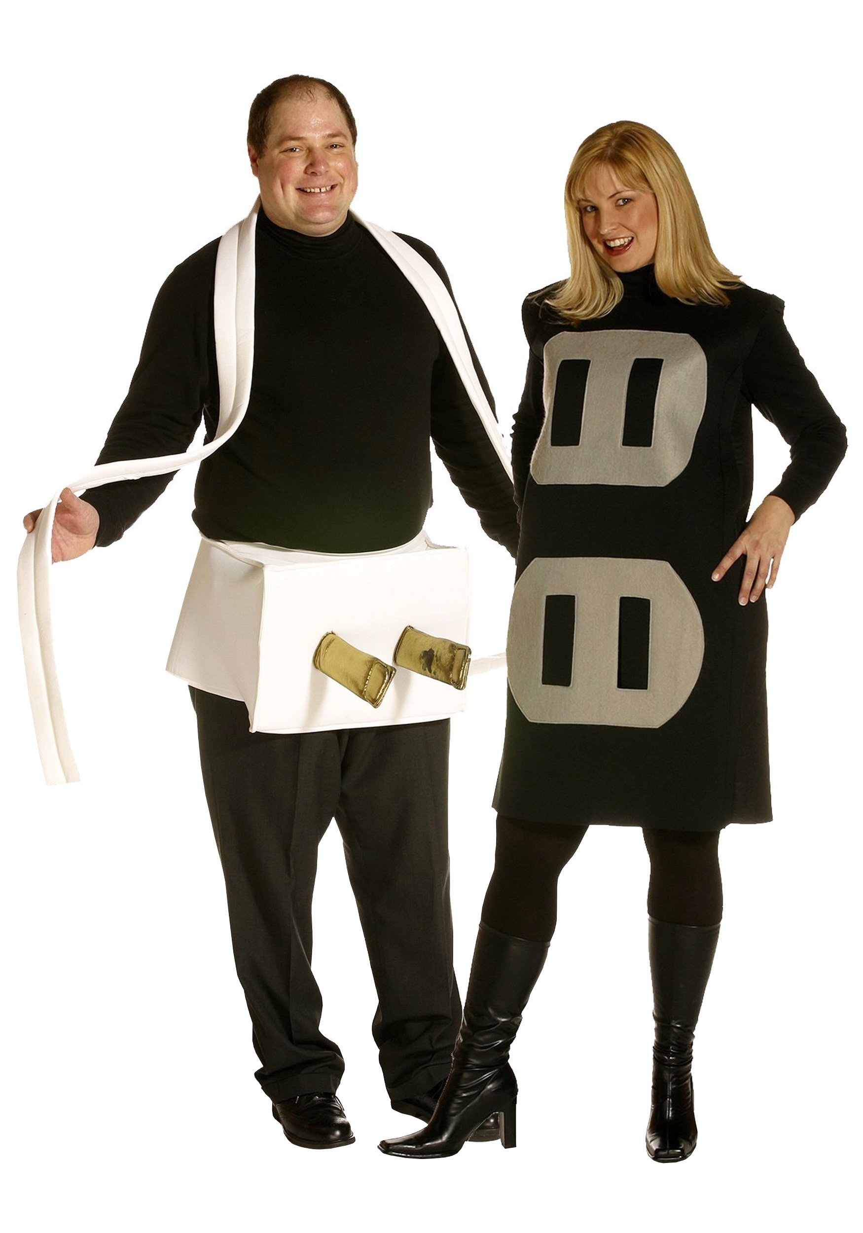 Which is more important the socket or the plug?Well, without a socket there is no access to the electrical grid. No way to power the lights in the house. No way to run the refrigerator. No heat, no warm water, no cooking. No recharging your cell phone. No watching TV. No working on your computer. No internet. That might be the line: a life without internet. Who could imagine such a life?!However, without a plug there is little need for access to the electrical grid. Sure the lights are wired into the house. Same with the heat, and water. But the fridge has a plug, that once plugged in keeps your great aunt Etta’s minced pie cold. Without a plug there is nothing to connect the television to the socket. No way to watch the latest How to Get Away With Murder.So, is it fair to say that they are equally important? We think so. Therefore, this Halloween, when your friends ask you why you and your wife are dressed in these Plus Size Plug and Socket Costumes, just say because “we need each other”. It will make your wife smile, and lets face it, you would somehow accidentally burn the house down without her. Then when you are alone you can woo her with song: “I got chills, they’re multiplying, And I’m losing control, ‘Cause the power, you’re supplying, It’s electrifying!”