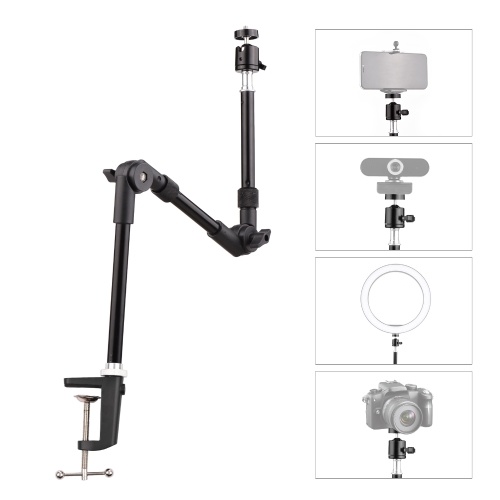 Features:¡¾Flexible Height Angle Adjusting¡¿Each bracket rod can be flexibly adjusted 360 rotation and 180 bending to any angle and position you need. And the 360 rotatable ballhead adapter make it easier to adjust the device angle and achieve vertical/horizontal usage quickly.¡¾Strong Joints with Fixed Gears¡¿Durable aluminum alloy construction and strong joints with fixed gears can avoid annoying bouncing and protect your valuable devices from falling.¡¾Convenient Desk Mount Design¡¿The desk mount clamp with non-slip protection pad and 4.8cm max. width can fix the stand to most table, bed headboard, nightstand, kitchen counter, etc, easy installation.¡¾Strong Compatibility¡¿3kg load capacity and with standard 1/4 inch screw, the metal bracket can work as a webcam stand, a microphone stand, a ring light stand, a phone stand, a tablet stand, a camera stand, a projector stand, etc.¡¾Wide Applications¡¿Suitable for live streaming, video conference, network teaching, video recording, product photography, and so on. You can use it at home, in office, at studio, etc. Fully folded design, more convenient for you to carry around.