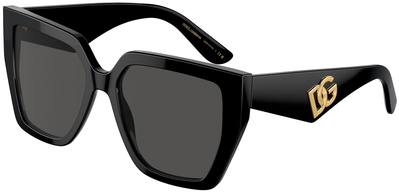 Square Shape/ Gold Dolce & Gabbana Logo On Both Temples/ 55mm Lens Width/ Dark Grey Lenses With Black Frame Finish