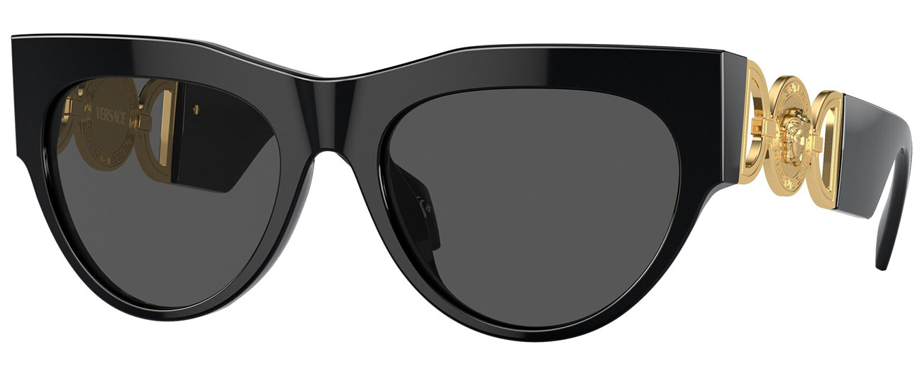 Cat Eye Shape/ Gold-Tone Medusa Hardware On Both Temples/ Acetate Frame Material/ 56mm Lens Width/ Dark Grey Lenses With Black Frame Finish